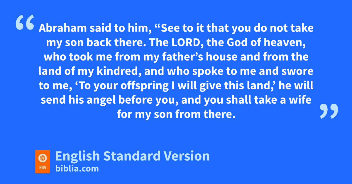 24 Now Abraham was old, well advanced in years. And the Lord mhad blessed Abraham in all things. 2 And Abraham said to his servant, nthe oldest of his household, who had charge of all that he had, o“Put your hand under my thigh, 3 that I may make you swear by the Lord, the God of heaven and God of the earth, that pyou will not take a wife for my son from the daughters of the Canaanites, among whom I dwell, 4 qbut will go to my country and to my kindred, and take a wife for my son Isaac.” 5 The servant said to him, “Perhaps the woman may not be willing to follow me to this land. Must I then take your son back to the land from which you came?” 6 Abraham said to him, “See to it that you do not take my son back there. 7 The Lord, the God of heaven, rwho took me from my father’s house and from the land of my kindred, and who spoke to me and swore to me, s‘To your offspring I will give this land,’ the will send his angel before you, and you shall take a wife for my son from there. 8 But if the woman is not willing to follow you, then uyou will be free from this oath of mine; only you must not take my son back there.” 9 So the servant vput his hand under the thigh of Abraham his master and swore to him concerning this matter.