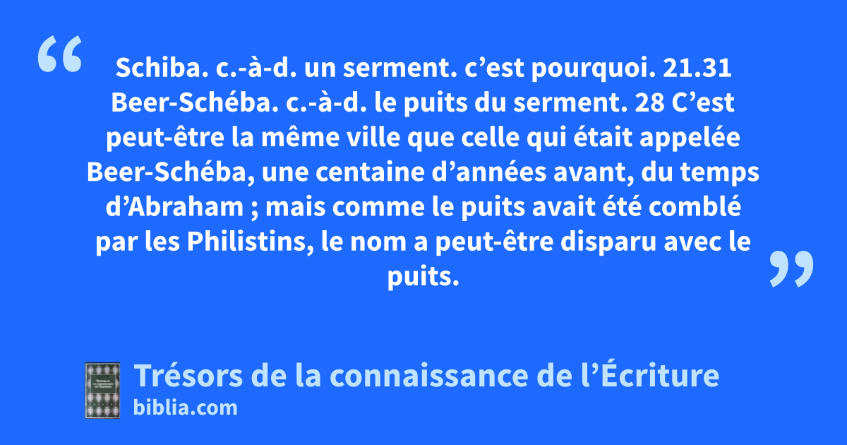 Schiba. c.-à-d. un serment. c’est pourquoi. 21.31 Beer-Schéba. c.-à-d. le puits du serment. 28 C’est peut-être la même ville que celle qui était appelée Beer-Schéba, une centaine d’années avant, du temps d’Abraham ; mais comme le puits avait été comblé par les Philistins, le nom a peut-être disparu avec le puits.