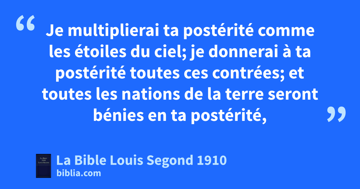 1Il y eut une famine dans le pays, outre la première famine qui eut lieu du temps d’Abraham; et Isaac alla vers Abimélec, roi des Philistins, à Guérar. 2L’Éternel lui apparut, et dit: Ne descends pas en Égypte, demeure dans le pays que je te dirai. 3Séjourne dans ce pays-ci: je aserai avec toi, et je te bénirai, car je donnerai toutes ces contrées à toi et à ta postérité, et je tiendrai le serment que j’ai fait à Abraham, ton père. 4bJe multiplierai ta postérité comme les étoiles du ciel; je donnerai à ta postérité toutes ces contrées; et toutes les nations de la terre seront bénies en ta postérité, 5parce qu’Abraham a obéi à ma voix, et qu’il a observé mes ordres, mes commandements, mes statuts et mes lois. 6Et Isaac resta à Guérar. 7Lorsque les gens du lieu faisaient des questions sur sa femme, il disait: C’est ma soeur; car il craignait, en disant ma femme, que les gens du lieu ne le tuassent, parce que Rebecca était belle de figure. 8Comme son séjour se prolongeait, il arriva qu’Abimélec, roi des Philistins, regardant par la fenêtre, vit Isaac qui plaisantait avec Rebecca, sa femme. 9Abimélec fit appeler Isaac, et dit: Certainement, c’est ta femme. Comment as-tu pu dire: C’est ma soeur? Isaac lui répondit: J’ai parlé ainsi, de peur de mourir à cause d’elle. 10Et Abimélec dit: Qu’est-ce que tu nous as fait? Peu s’en est fallu que quelqu’un du peuple n’ait couché avec ta femme, et tu nous aurais rendus coupables. 11Alors Abimélec fit cette ordonnance pour tout le peuple: Celui qui touchera à cet homme ou à sa femme sera mis à mort.