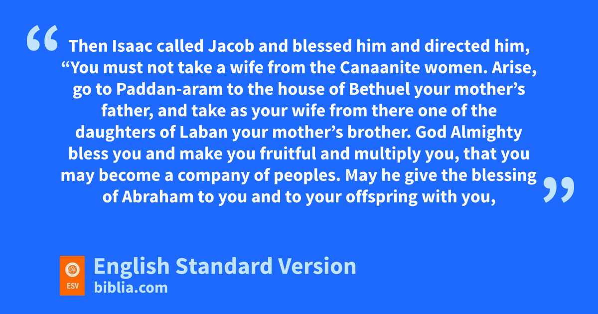 28 Then Isaac called Jacob gand blessed him and directed him, f“You must not take a wife from the Canaanite women. 2 hArise, go to Paddan-aram to the house of iBethuel your mother’s father, and take as your wife from there one of the daughters of Laban your mother’s brother. 3 jGod Almighty1 bless you and make you fruitful and multiply you, that you may become a company of peoples. 4 May he give kthe blessing of Abraham to you and to your offspring with you, that you may take possession of lthe land of your sojournings that God gave to Abraham!” 5 Thus Isaac sent Jacob away. And he went to Paddan-aram, to Laban, the son of Bethuel the Aramean, the brother of Rebekah, Jacob’s and Esau’s mother.