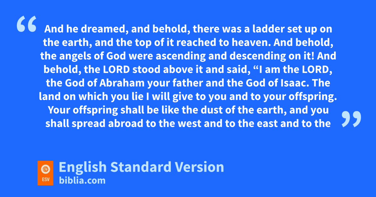 10 Jacob left pBeersheba and went toward qHaran. 11 And he came to a certain place and stayed there that night, because the sun had set. Taking one of the stones of the place, he put it under his head and lay down in that place to sleep. 12 And he rdreamed, and behold, there was a ladder2 set up on the earth, and the top of it reached to heaven. And behold, sthe angels of God were ascending and descending on it! 13 And behold, tthe Lord stood above it3 and said, u“I am the Lord, the God of Abraham your father and the God of Isaac. vThe land on which you lie I will give to you and to your offspring. 14 Your offspring shall be like wthe dust of the earth, and you shall spread abroad to the west and to the east and to the north and to the south, and in you and xyour offspring shall all the families of the earth be blessed. 15 Behold, yI am with you and will keep you wherever you go, and zwill bring you back to this land. For I will anot leave you until I have done what I have promised you.” 16 Then Jacob awoke from his sleep and said, “Surely the Lord is bin this place, and I did not know it.” 17 And he was afraid and said, “How awesome is this place! This is none other than the house of God, and this is the gate of heaven.”