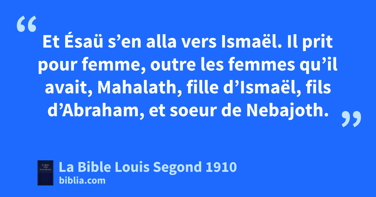 6Ésaü vit qu’Isaac avait béni Jacob, et qu’il l’avait envoyé à Paddan-Aram pour y prendre une femme, et qu’en le bénissant il lui avait donné cet ordre: Tu ne prendras pas une femme parmi les filles de Canaan. 7Il vit que Jacob avait obéi à son père et à sa mère, et qu’il était parti pour Paddan-Aram. 8Ésaü comprit ainsi que les filles de Canaan déplaisaient à Isaac, son père. 9Et Ésaü s’en alla vers Ismaël. Il prit pour femme, outre les femmes qu’il avait, Mahalath, fille d’Ismaël, fils d’Abraham, et soeur de Nebajoth.