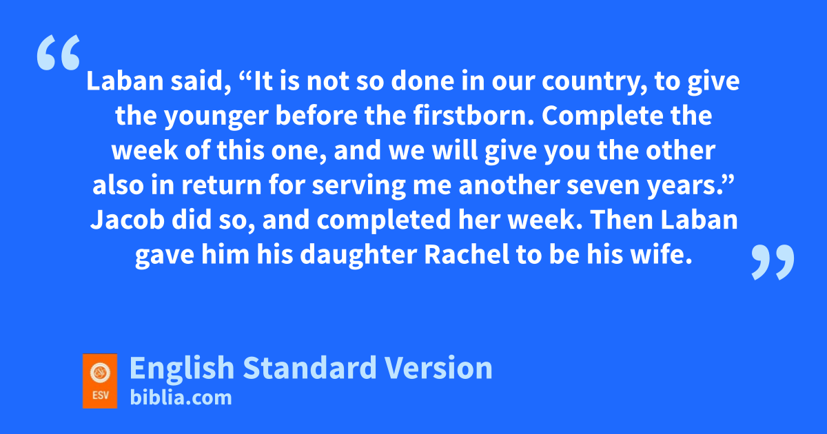 21 Then Jacob said to Laban, “Give me my wife that I may go in to her, for my time is completed.” 22 So Laban gathered together all the people of the place and rmade a feast. 23 But in the evening he took his daughter Leah and brought her to Jacob, and he went in to her. 24 (Laban gave2 shis female servant Zilpah to his daughter Leah to be her servant.) 25 And in the morning, behold, it was Leah! And Jacob said to Laban, “What is this you have done to me? Did I not serve with you for Rachel? Why then have you deceived me?” 26 Laban said, “It is not so done in our country, to give the younger before the firstborn. 27 tComplete the week of this one, and we will give you the other also in return for serving me another seven years.” 28 Jacob did so, and completed her week. Then Laban gave him his daughter Rachel to be his wife. 29 (Laban gave uhis female servant Bilhah to his daughter Rachel to be her servant.) 30 So Jacob went in to Rachel also, and he loved Rachel more than Leah, and served Laban vfor another seven years.