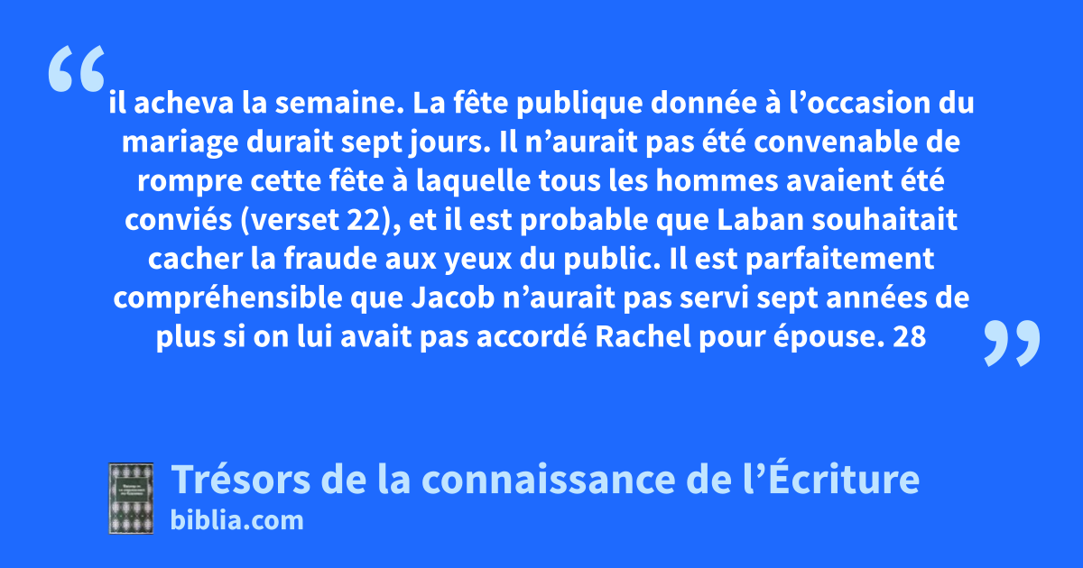 il acheva la semaine. La fête publique donnée à l’occasion du mariage durait sept jours. Il n’aurait pas été convenable de rompre cette fête à laquelle tous les hommes avaient été conviés (verset 22), et il est probable que Laban souhaitait cacher la fraude aux yeux du public. Il est parfaitement compréhensible que Jacob n’aurait pas servi sept années de plus si on lui avait pas accordé Rachel pour épouse. 28