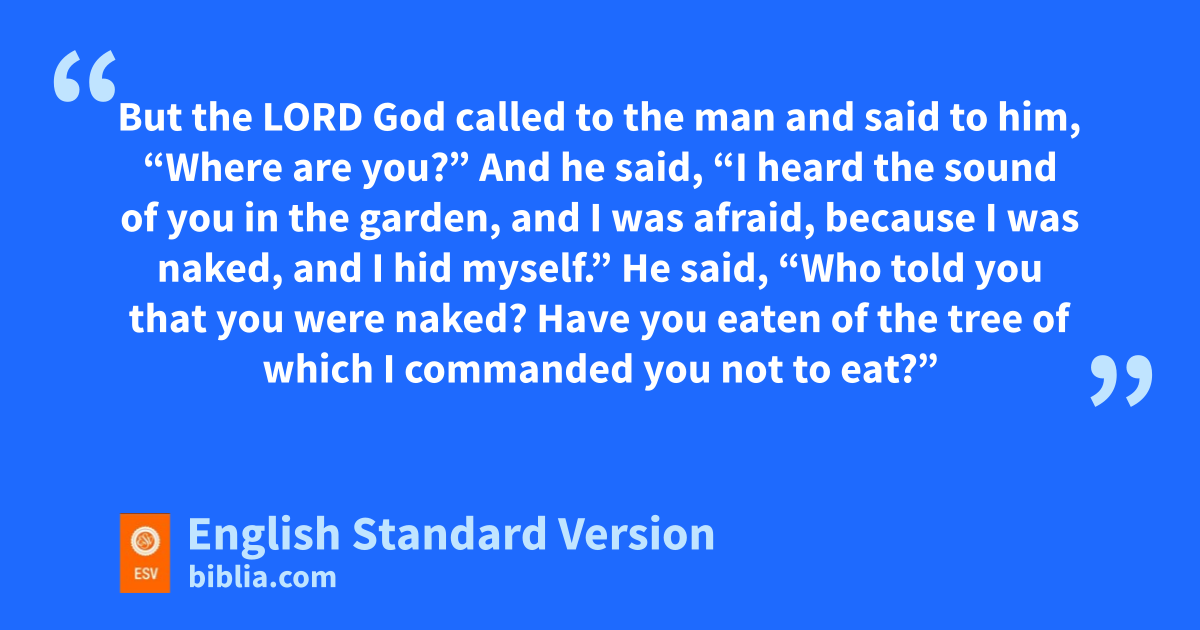 8 And they heard the sound of the Lord God walking in the garden in the cool3 of the day, and the man and his wife bhid themselves from the presence of the Lord God among the trees of the garden. 9 But the Lord God called to the man and said to him, “Where are you?”4 10 And he said, “I heard the sound of you in the garden, and I was afraid, cbecause I was naked, and I hid myself.” 11 He said, “Who told you that you were naked? Have you eaten of the tree of which I commanded you not to eat?” 12 The man said, d“The woman whom you gave to be with me, she gave me fruit of the tree, and I ate.” 13 Then the Lord God said to the woman, “What is this that you have done?” The woman said, e“The serpent deceived me, and I ate.”
