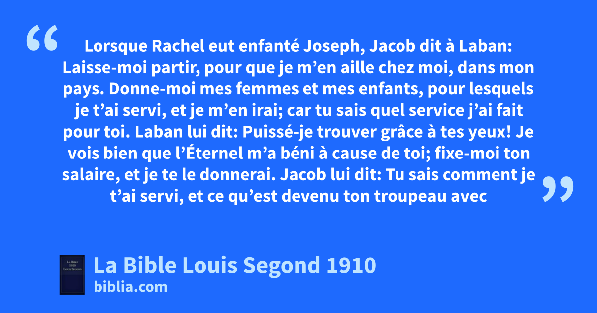 25Lorsque Rachel eut enfanté Joseph, Jacob dit à Laban: Laisse-moi partir, pour que je m’en aille chez moi, dans mon pays. 26Donne-moi mes femmes et mes enfants, pour lesquels je t’ai servi, et je m’en irai; car tu sais quel service j’ai fait pour toi. 27Laban lui dit: Puissé-je trouver grâce à tes yeux! Je vois bien que l’Éternel m’a béni à cause de toi; 28fixe-moi ton salaire, et je te le donnerai. 29Jacob lui dit: Tu sais comment je t’ai servi, et ce qu’est devenu ton troupeau avec moi; 30car le peu que tu avais avant moi s’est beaucoup accru, et l’Éternel t’a béni sur mes pas. Maintenant, quand travaillerai-je aussi pour ma maison? 31Laban dit: Que te donnerai-je? Et Jacob répondit: Tu ne me donneras rien. Si tu consens à ce que je vais te dire, je ferai paître encore ton troupeau, et je le garderai. 32Je parcourrai aujourd’hui tout ton troupeau; mets à part parmi les brebis tout agneau tacheté et marqueté et tout agneau noir, et parmi les chèvres tout ce qui est marqueté et tacheté. Ce sera mon salaire. 33Ma droiture répondra pour moi demain, quand tu viendras voir mon salaire; tout ce qui ne sera pas tacheté et marqueté parmi les chèvres, et noir parmi les agneaux, ce sera de ma part un vol. 34Laban dit: Eh bien! qu’il en soit selon ta parole. 35Ce même jour, il mit à part les boucs rayés et marquetés, toutes les chèvres tachetées et marquetées, toutes celles où il y avait du blanc, et tout ce qui était noir parmi les brebis. Il les remit entre les mains de ses fils. 36Puis il mit l’espace de trois journées de chemin entre lui et Jacob; et Jacob fit paître le reste du troupeau de Laban. 37Jacob prit des branches vertes de peuplier, d’amandier et de platane; il y pela des bandes blanches, mettant à nu le blanc qui était sur les branches. 38Puis il plaça les branches, qu’il avait pelées, dans les auges, dans les abreuvoirs, sous les yeux des brebis qui venaient boire, pour qu’elles entrassent en chaleur en venant boire. 39Les brebis entraient en chaleur près des branches, et elles faisaient des petits rayés, tachetés et marquetés. 40Jacob séparait les agneaux, et il mettait ensemble ce qui était rayé et tout ce qui était noir dans le troupeau de Laban. Il se fit ainsi des troupeaux à part, qu’il ne réunit point au troupeau de Laban. 41Toutes les fois que les brebis vigoureuses entraient en chaleur, Jacob plaçait les branches dans les auges, sous les yeux des brebis, pour qu’elles entrassent en chaleur près des branches. 42Quand les brebis étaient chétives, il ne les plaçait point; de sorte que les chétives étaient pour Laban, et les vigoureuses pour Jacob. 43Cet homme devint de plus en plus riche; il eut du menu bétail en abondance, des servantes et des serviteurs, des chameaux et des ânes.