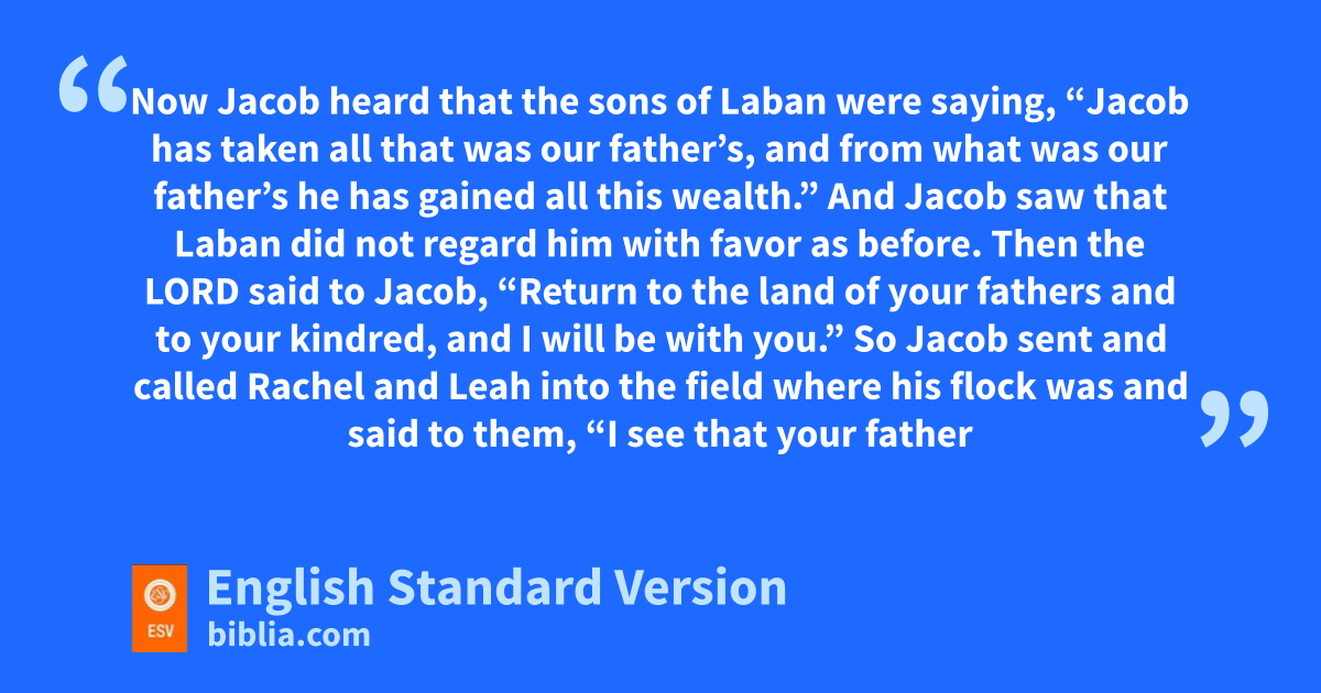 31 Now Jacob heard that the sons of Laban were saying, “Jacob has taken all that was our father’s, and from what was our father’s he has gained all this wealth.” 2 And Jacob saw athat Laban did not regard him with favor as before. 3 Then the Lord said to Jacob, b“Return to the land of your fathers and to your kindred, and I will be with you.”