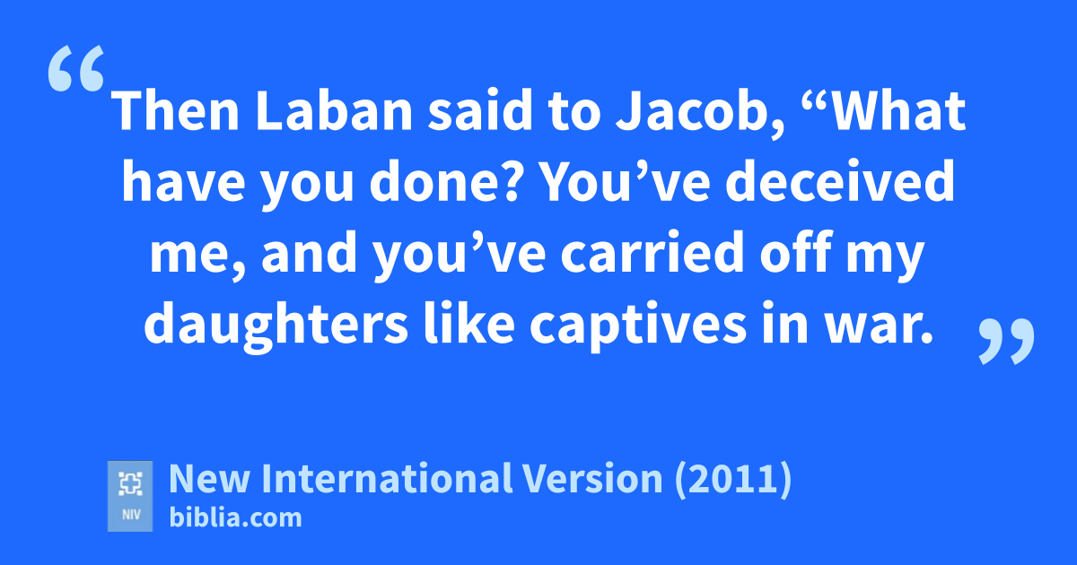 25 Jacob had pitched his tent in the hill country of Gileads when Laban overtook him, and Laban and his relatives camped there too. 26 Then Laban said to Jacob, “What have you done?t You’ve deceived me,u and you’ve carried off my daughters like captives in war.v 27 Why did you run off secretly and deceive me? Why didn’t you tell me,w so I could send you away with joy and singing to the music of timbrelsx and harps?y 28 You didn’t even let me kiss my grandchildren and my daughters goodbye.z You have done a foolish thing. 29 I have the power to harm you;a but last night the God of your fatherb said to me, ‘Be careful not to say anything to Jacob, either good or bad.’c 30 Now you have gone off because you longed to return to your father’s household.d But why did you steale my gods?f”