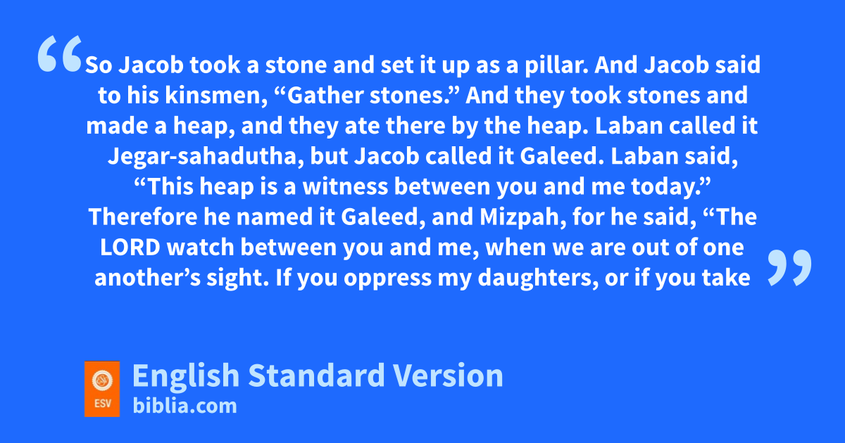 43 Then Laban answered and said to Jacob, “The daughters are my daughters, the children are my children, the flocks are my flocks, and all that you see is mine. But what can I do this day for these my daughters or for their children whom they have borne? 44 Come now, jlet us make a covenant, you and I. kAnd let it be a witness between you and me.” 45 So Jacob ltook a stone and set it up as a pillar. 46 And Jacob said to his kinsmen, “Gather stones.” And they took stones and made a heap, and they ate there by the heap. 47 Laban called it Jegar-sahadutha,4 but Jacob called it Galeed.5 48 Laban said, m“This heap is a witness between you and me today.” Therefore he named it Galeed, 49 nand Mizpah,6 for he said, “The Lord watch between you and me, when we are out of one another’s sight. 50 If you oppress my daughters, or if you take wives besides my daughters, although no one is with us, see, oGod is witness between you and me.”