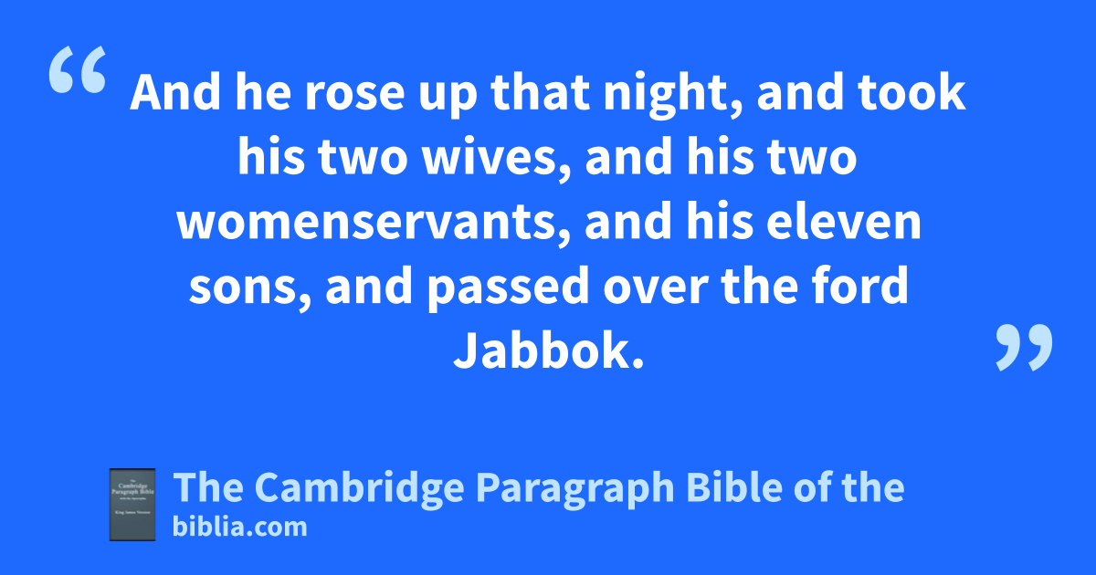 XXXII. And Jacob went on his way, and the angels of God met him. 2 And when Jacob saw them, he said, This is God’s ahost: and he called the name of that place * Mahanaim. 3 And Jacob sent messengers before him to Esau his brother unto the land of bSeir, the * country of Edom. 4 And he commanded them, saying, Thus shall ye speak unto my lord Esau; Thy servant Jacob saith thus, I have sojourned with Laban, and stayed there until now: 5 and I have oxen, and asses, flocks, and menservants, and womenservants: and I have sent to tell my lord, that cI may find grace in thy sight. 6 And the messengers returned to Jacob, saying, We came to thy brother Esau, and also dhe cometh to meet thee, and four hundred men with him. 7 Then Jacob was greatly afraid and distressed: and he divided the people that was with him, and the flocks, and herds, and the camels, into two bands; 8 and said, If Esau come to the one company, and smite it, then the other company which is left shall escape. 9 And Jacob said, eO God of my father Abraham, and God of my father Isaac, the Lord fwhich saidst unto me, Return unto thy country, and to thy kindred, and I will deal well with thee: 10 * I am not worthy of the least of all the gmercies, and of all the truth, which thou hast shewed unto thy servant; for with my staff I passed over this Jordan; and now I am become two bands. 11 Deliver me, I pray thee, from the hand of my brother, from the hand of Esau: for I fear him, lest he will come and smite me, and the mother * with the children. 12 And hthou saidst, I will surely do thee good, and make thy seed as the sand of the sea, which cannot be numbered for multitude. 13 And he lodged there that same night; and took of that which came to his hand ia present for Esau his brother; 14 two hundred she goats, and twenty he goats, two hundred ewes, and twenty rams, 15 thirty milch camels with their colts, forty kine, and ten bulls, twenty she asses, and ten foals. 16 And he delivered them into the hand of his servants, every drove by themselves; and said unto his servants, Pass over before me, and put a space betwixt drove and drove. 17 And he commanded the foremost, saying, When Esau my brother meeteth thee, and asketh thee, saying, Whose art thou? and whither goest thou? and whose are these before thee? 18 then thou shalt say, They be thy servant Jacob’s; it is a present sent unto my lord Esau: and behold, also he is behind us. 19 And so commanded he the second, and the third, and all that followed the droves, saying, On this manner shall you speak unto Esau, when you find him. 20 And say ye moreover, Behold, thy servant Jacob is behind us. For he said, I will appease him with the present that goeth before me, and afterward I will see his face; peradventure he will accept * of me. 21 So went the present over before him: and himself lodged that night in the company. 22 And he rose up that night, and took his two wives, and his two womenservants, and his eleven sons, and passed over the ford kJabbok. 23 And he took them, and * sent them over the brook, and sent over that he had.
