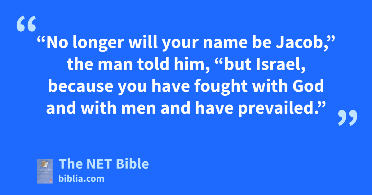 32:26 Then the man60 said, “Let me go, for the dawn is breaking.”61 “I will not let you go,” Jacob replied,62 “unless you bless me.”63 32:27 The man asked him,64 “What is your name?”65 He answered, “Jacob.” 32:28 “No longer will your name be Jacob,” the man told him,66 “but Israel,67 because you have fought68 with God and with men and have prevailed.”