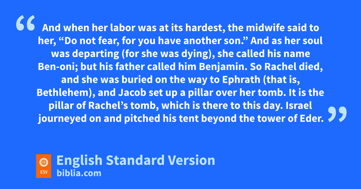 16 Then they journeyed from Bethel. When they were still some distance6 from Ephrath, Rachel went into labor, and she had hard labor. 17 And when her labor was at its hardest, the midwife said to her, “Do not fear, for vyou have another son.” 18 And as her soul was departing (for she was dying), she called his name Ben-oni;7 wbut his father called him Benjamin.8 19 So xRachel died, and she was buried on the way to yEphrath (that is, Bethlehem), 20 and Jacob set up a pillar over her tomb. It is zthe pillar of Rachel’s tomb, which is there to this day. 21 Israel journeyed on and pitched his tent beyond the tower of Eder.