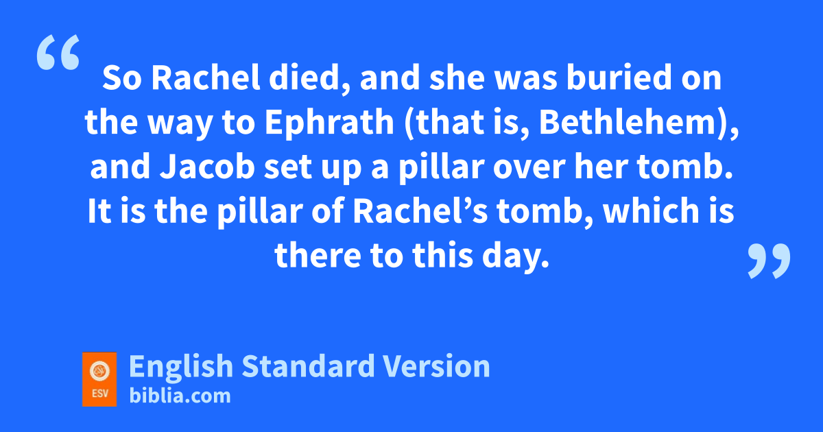 16 Then they journeyed from Bethel. When they were still some distance6 from Ephrath, Rachel went into labor, and she had hard labor. 17 And when her labor was at its hardest, the midwife said to her, “Do not fear, for vyou have another son.” 18 And as her soul was departing (for she was dying), she called his name Ben-oni;7 wbut his father called him Benjamin.8 19 So xRachel died, and she was buried on the way to yEphrath (that is, Bethlehem), 20 and Jacob set up a pillar over her tomb. It is zthe pillar of Rachel’s tomb, which is there to this day. 21 Israel journeyed on and pitched his tent beyond the tower of Eder.