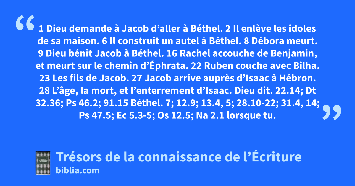 1 Dieu demande à Jacob d’aller à Béthel. 2 Il enlève les idoles de sa maison. 6 Il construit un autel à Béthel. 8 Débora meurt. 9 Dieu bénit Jacob à Béthel. 16 Rachel accouche de Benjamin, et meurt sur le chemin d’Éphrata. 22 Ruben couche avec Bilha. 23 Les fils de Jacob. 27 Jacob arrive auprès d’Isaac à Hébron. 28 L’âge, la mort, et l’enterrement d’Isaac.