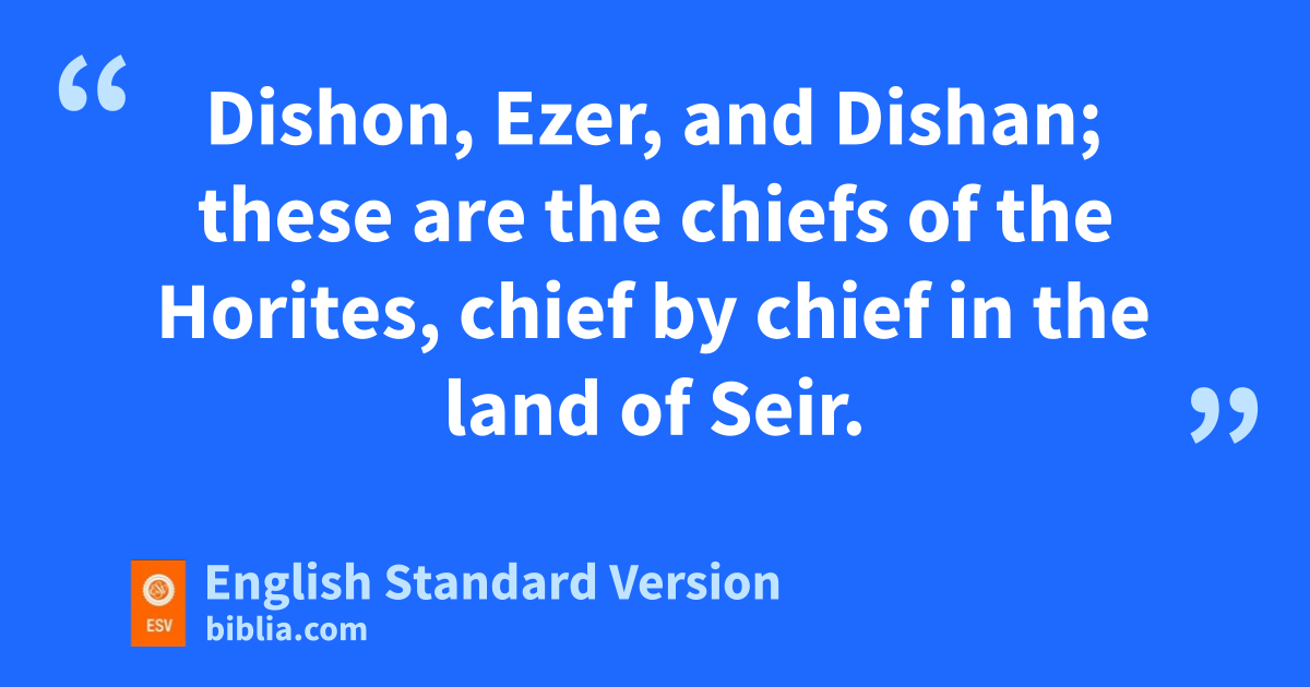 20 yThese are the sons of zSeir the Horite, the inhabitants of the land: Lotan, Shobal, Zibeon, Anah, 21 Dishon, Ezer, and Dishan; these are the chiefs of the Horites, the sons of Seir in the land of Edom. 22 The sons of Lotan were Hori and Hemam; and Lotan’s sister was Timna. 23 These are the sons of Shobal: Alvan, Manahath, Ebal, Shepho, and Onam. 24 These are the sons of Zibeon: Aiah and Anah; he is the Anah who found the hot springs in the wilderness, as he pastured the donkeys of Zibeon his father. 25 These are the children of Anah: Dishon and aOholibamah the daughter of Anah. 26 These are the sons of Dishon: Hemdan, Eshban, Ithran, and Cheran. 27 These are the sons of Ezer: Bilhan, Zaavan, and Akan. 28 These are the sons of Dishan: Uz and Aran. 29 These are the chiefs of the Horites: the bchiefs Lotan, Shobal, Zibeon, Anah, 30 Dishon, Ezer, and Dishan; these are the chiefs of the Horites, chief by chief in the land of Seir.