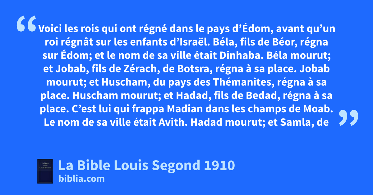 31eVoici les rois qui ont régné dans le pays d’Édom, avant qu’un roi régnât sur les enfants d’Israël. 32Béla, fils de Béor, régna sur Édom; et le nom de sa ville était Dinhaba. 33Béla mourut; et Jobab, fils de Zérach, de Botsra, régna à sa place. 34Jobab mourut; et Huscham, du pays des Thémanites, régna à sa place. 35Huscham mourut; et Hadad, fils de Bedad, régna à sa place. C’est lui qui frappa Madian dans les champs de Moab. Le nom de sa ville était Avith. 36Hadad mourut; et Samla, de Masréka, régna à sa place. 37Samla mourut; et Saül, de Rehoboth sur le fleuve, régna à sa place. 38Saül mourut; et Baal-Hanan, fils d’Acbor, régna à sa place. 39Baal-Hanan, fils d’Acbor, mourut; et Hadar régna à sa place. Le nom de sa ville était Pau; et le nom de sa femme Mehéthabeel, fille de Mathred, fille de Mézahab. 40fVoici les noms des chefs issus d’Ésaü, selon leurs tribus, selon leurs territoires, et d’après leurs noms: le chef Thimna, le chef Alva, le chef Jetheth, 41le chef Oholibama, le chef Éla, le chef Pinon, 42le chef Kenaz, le chef Théman, le chef Mibtsar, 43le chef Magdiel, le chef Iram. Ce sont là les chefs d’Édom, selon leurs habitations dans le pays qu’ils possédaient. C’est là Ésaü, père d’Édom.