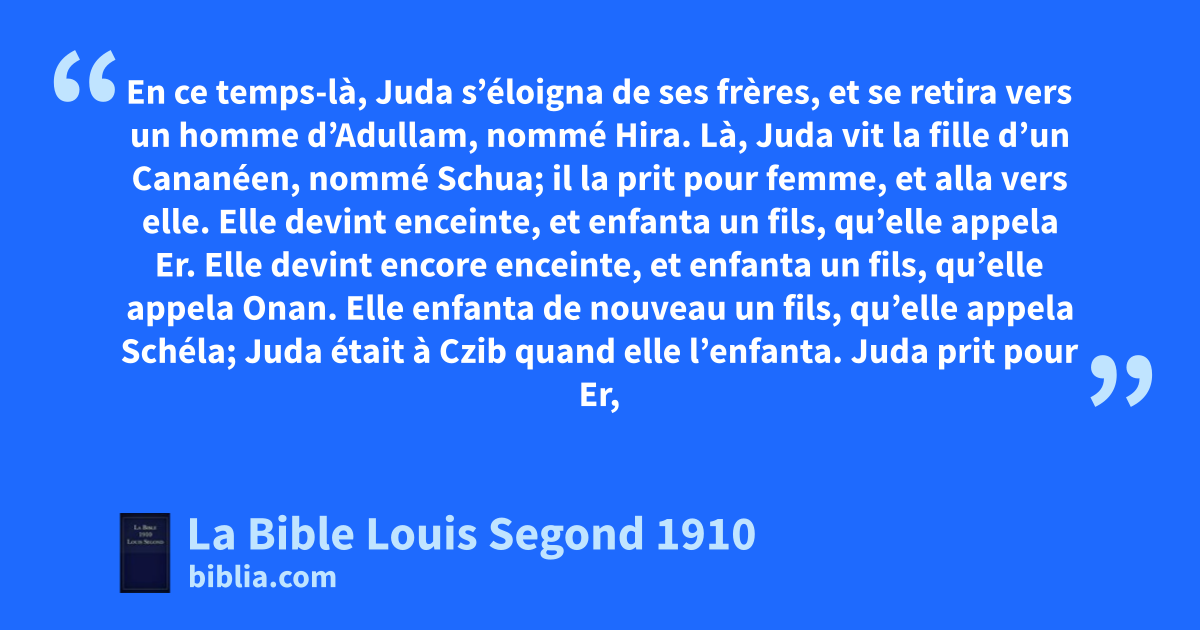 1En ce temps-là, Juda s’éloigna de ses frères, et se retira vers un homme d’Adullam, nommé Hira. 2Là, aJuda vit la fille d’un Cananéen, nommé Schua; il la prit pour femme, et alla vers elle. 3Elle devint enceinte, et enfanta un fils, qu’elle appela Er. 4Elle devint encore enceinte, et enfanta un fils, qu’elle appela Onan. 5Elle enfanta de nouveau un fils, qu’elle appela bSchéla; Juda était à Czib quand elle l’enfanta. 6Juda prit pour Er, son premier-né, une femme nommée Tamar. 7Er, premier-né de Juda, était méchant aux yeux de l’Éternel; et l’Éternel le fit mourir. 8Alors Juda dit à Onan: Va vers la femme de ton frère, prends-la, comme beau-frère, et suscite une postérité à ton frère. 9Onan, sachant que cette postérité ne serait pas à lui, se souillait à terre lorsqu’il allait vers la femme de son frère, afin de ne pas donner de postérité à son frère. 10Ce qu’il faisait déplut à l’Éternel, qui le fit aussi mourir. 11Alors Juda dit à Tamar, sa belle-fille: Demeure veuve dans la maison de ton père, jusqu’à ce que Schéla, mon fils, soit grand. Il parlait ainsi dans la crainte que Schéla ne mourût comme ses frères. Tamar s’en alla, et elle habita dans la maison de son père.