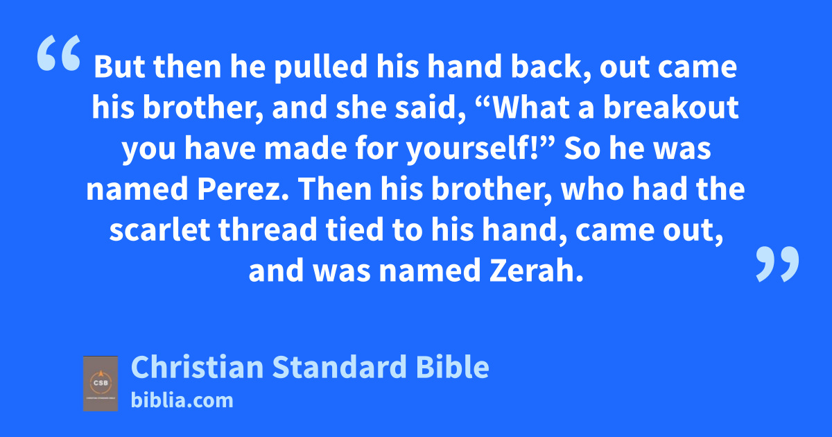27 When the time came for her to give birth, there were twins in her womb. 28 As she was giving birth, one of them put out his hand, and the midwife took it and tied a scarlet thread around it, announcing, “This one came out first.” 29 But then he pulled his hand back, out came his brother, and she said, “What a breakout you have made for yourself!” So he was named Perez.B,j 30 Then his brother, who had the scarlet thread tied to his hand, came out, and was named Zerah.C