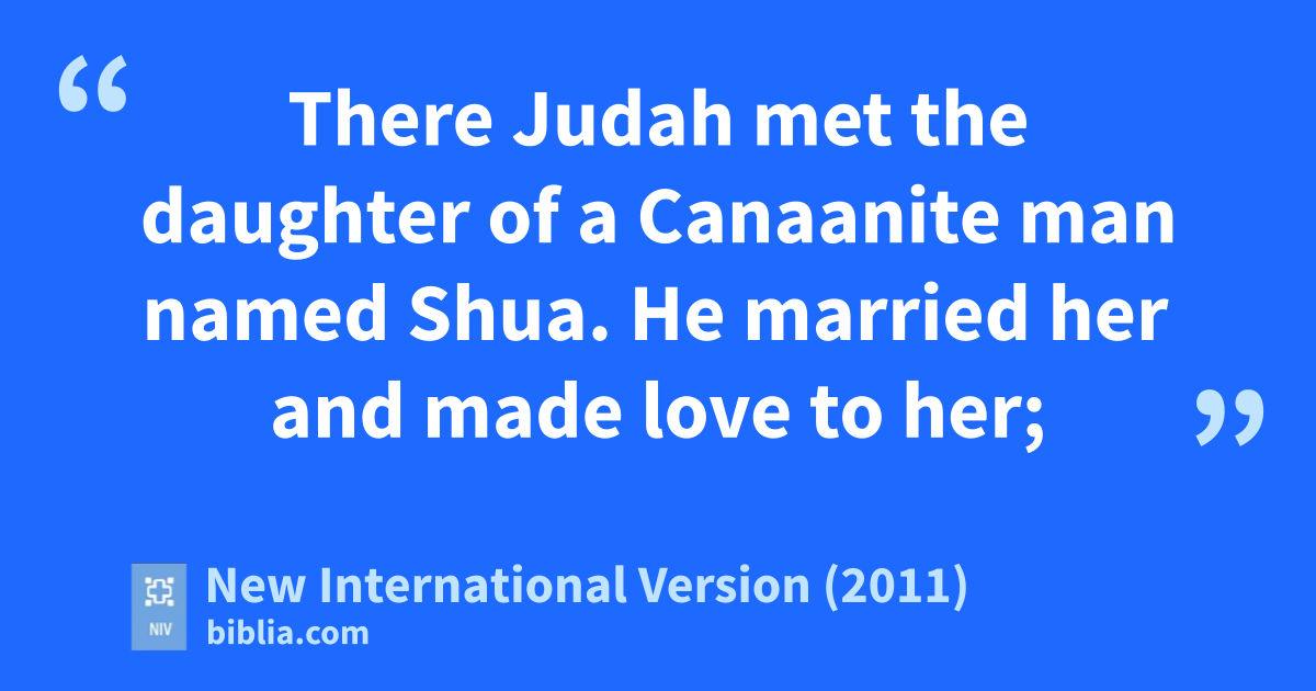 38 At that time, Judahu left his brothers and went down to stay with a man of Adullamv named Hirah.w 2 There Judah met the daughter of a Canaanite man named Shua.x He married her and made love to her; 3 she became pregnant and gave birth to a son, who was named Er.y 4 She conceived again and gave birth to a son and named him Onan.z 5 She gave birth to still another son and named him Shelah.a It was at Kezib that she gave birth to him.