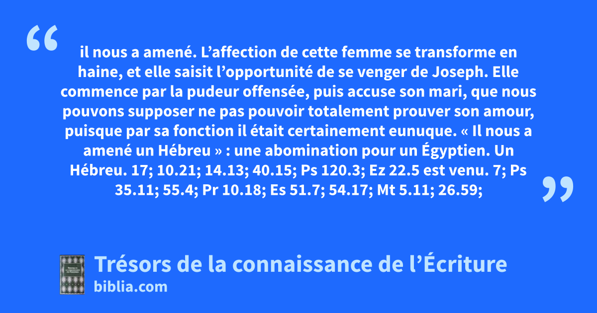 il nous a amené. L’affection de cette femme se transforme en haine, et elle saisit l’opportunité de se venger de Joseph. Elle commence par la pudeur offensée, puis accuse son mari, que nous pouvons supposer ne pas pouvoir totalement prouver son amour, puisque par sa fonction il était certainement eunuque. « Il nous a amené un Hébreu » : une abomination pour un Égyptien. Un Hébreu. 17; 10.21; 14.13; 40.15; Ps 120.3; Ez 22.5 est venu. 7; Ps 35.11; 55.4; Pr 10.18; Es 51.7; 54.17; Mt 5.11; 26.59; Lc 23.2 2Co 6.8; 1P 2.20; 3.14-18; 4.14-19