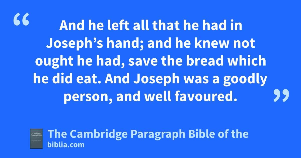 XXXIX. And Joseph was brought down to Egypt; and aPotiphar, an officer of Pharaoh, captain of the guard, an Egyptian, bought him of the hand of the bIshmeelites, which had brought him down thither. 2 And cthe Lord was with Joseph, and he was a prosperous man; and he was in the house of his master the Egyptian. 3 And his master saw that the Lord was with him, and that the Lord dmade all that he did to prosper in his hand. 4 And Joseph efound grace in his sight, and he served him: and he made him overseer over his house, and all that he had he put into his hand. 5 And it came to pass from the time that he had made him overseer in his house, and over all that he had, that the Lord blessed the Egyptian’s house ffor Joseph’s sake; and the blessing of the Lord was upon all that he had in the house, and in the field. 6 And he left all that he had in Joseph’s hand; and he knew not ought he had, save the bread which he did eat. And Joseph gwas a goodly person, and well favoured. 7 And it came to pass after these things, that his master’s wife cast her eyes upon Joseph; and she said, Lie with me. 8 But he refused, and said unto his master’s wife, Behold, my master wotteth not what is with me in the house, and hhe hath committed all that he hath to my hand; 9 There is none greater in this house than I; neither hath he ikept back any thing from me but thee, because thou art his wife: how then can I do this great wickedness, and ksin against God? 10 And it came to pass, as she spake to Joseph day by day, that he hearkened not unto her, to lie by her, or to be with her. 11 And it came to pass about this time, that Joseph went into the house to do his business; and there was none of the men of the house there within. 12 And she caught him by his garment, saying, Lie with me: and he left his garment in her hand, and fled, and got him out. 13 And it came to pass, when she saw that he had left his garment in her hand, and was fled forth, 14 that she called unto the men of her house, and spake unto them, saying, See, he hath brought in a Hebrew unto us to mock us; he came in unto me to lie with me, and I cried with a * loud voice: 15 and it came to pass, when he heard that I lifted up my voice and cried, that he left his garment with me, and fled, and got him out. 16 And she laid up his garment by her, until his lord came home. 17 And she spake unto him according to these words, saying, The Hebrew servant, which thou hast brought unto us, came in unto me to mock me: 18 and it came to pass, as I lift up my voice and cried, that he left his garment with me, and fled out. 19 And it came to pass, when his master heard the words of his wife, which she spake unto him, saying, After this manner did thy servant to me; that his wrath was kindled. 20 And Joseph’s master took him, and lput him into the mprison, a place where the king’s prisoners were bound: and he was there in the mprison. 21 But nthe Lord was with Joseph, and * shewed him mercy, and ogave him favour in the sight of the keeper of the prison. 22 And the keeper of the prison pcommitted to Joseph’s hand all the prisoners that were in the prison; and whatsoever they did there, he was the doer of it. 23 The keeper of the prison looked not to any thing that was under his hand; because qthe Lord was with him, and that which he did, the Lord made it to prosper.