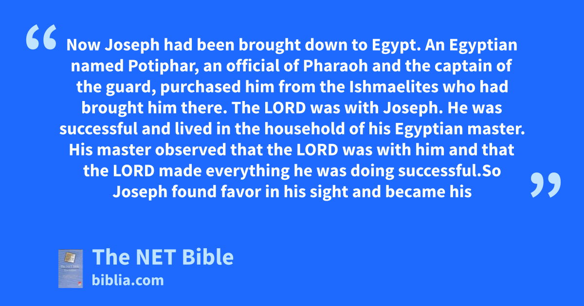 39:1 Now Joseph had been brought down to Egypt.1 An Egyptian named Potiphar, an official of Pharaoh and the captain of the guard,2 purchased him from3 the Ishmaelites who had brought him there. 39:2 The Lord was with Joseph. He was successful4 and lived5 in the household of his Egyptian master. 39:3 His master observed that the Lord was with him and that the Lord made everything he was doing successful.6 39:4 So Joseph found favor in his sight and became his personal attendant.7 Potiphar appointed Joseph8 overseer of his household and put him in charge9 of everything he owned. 39:5 From the time10 Potiphar11 appointed him over his household and over all that he owned, the Lord blessed12 the Egyptian’s household for Joseph’s sake. The blessing of the Lord was on everything that he had, both13 in his house and in his fields.14 39:6 So Potiphar15 left16 everything he had in Joseph’s care;17 he gave no thought18 to anything except the food he ate.19