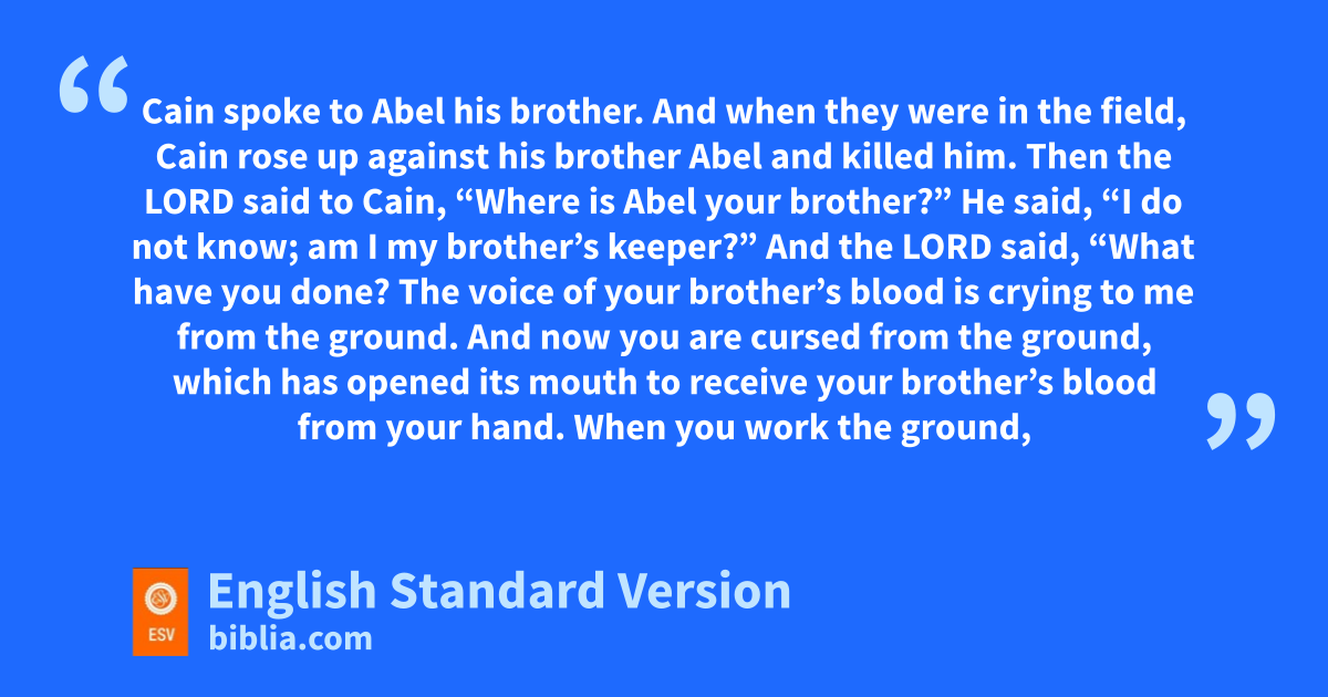 8 Cain spoke to Abel his brother.4 And when they were in the field, Cain rose up against his brother Abel and akilled him. 9 Then the Lord said to Cain, “Where is Abel your brother?” He said, b“I do not know; am I my brother’s keeper?” 10 And the Lord said, “What have you done? The voice of your brother’s blood cis crying to me from the ground. 11 And now dyou are cursed from the ground, which has opened its mouth to receive your brother’s blood from your hand. 12 When you work the ground, it shall no longer yield to you its strength. You shall be a fugitive and a wanderer on the earth.” 13 Cain said to the Lord, “My epunishment is greater than I can bear.5 14 Behold, fyou have driven me today away from the ground, and gfrom your face I shall be hidden. I shall be a fugitive and a wanderer on the earth, hand whoever finds me will kill me.” 15 Then the Lord said to him, “Not so! If anyone kills Cain, vengeance shall be taken on him isevenfold.” And the Lord jput a mark on Cain, lest any who found him should attack him. 16 Then Cain went away from the presence of the Lord and settled in the land of Nod,6 east of Eden.