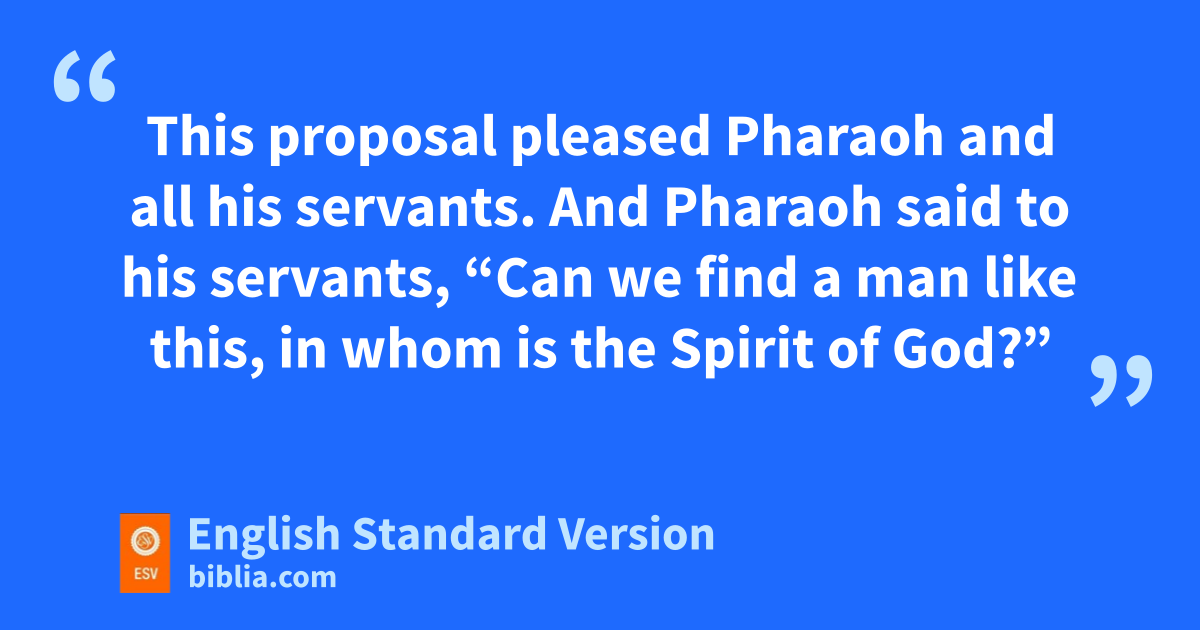 37 This proposal pleased Pharaoh and all his servants. 38 And Pharaoh said to his servants, “Can we find a man like this, uin whom is the Spirit of God?”3 39 Then Pharaoh said to Joseph, “Since God has shown you all this, there is none so discerning and wise as you are. 40 vYou shall be over my house, and all my people shall order themselves as you command.4 Only as regards the throne will I be greater than you.” 41 And Pharaoh said to Joseph, “See, wI have set you over all the land of Egypt.” 42 Then Pharaoh xtook his signet ring from his hand and put it on Joseph’s hand, and yclothed him in garments of fine linen zand put a gold chain about his neck. 43 And he made him ride in his second chariot. aAnd they called out before him, “Bow the knee!”5 Thus he set him bover all the land of Egypt. 44 Moreover, Pharaoh said to Joseph, “I am Pharaoh, and cwithout your consent no one shall lift up hand or foot in all the land of Egypt.” 45 And Pharaoh called Joseph’s name Zaphenath-paneah. And he gave him in marriage Asenath, the daughter of Potiphera priest of On. So Joseph went out over the land of Egypt.