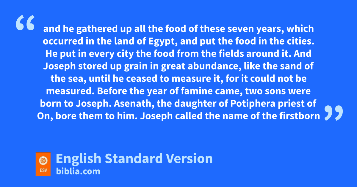 50 Before the year of famine came, ftwo sons were born to Joseph. Asenath, the daughter of Potiphera priest of On, bore them to him. 51 Joseph called the name of the firstborn Manasseh. “For,” he said, “God has made me forget all my hardship and all my father’s house.”6 52 The name of the second he called Ephraim, “For God has gmade me fruitful in the land of my affliction.”7