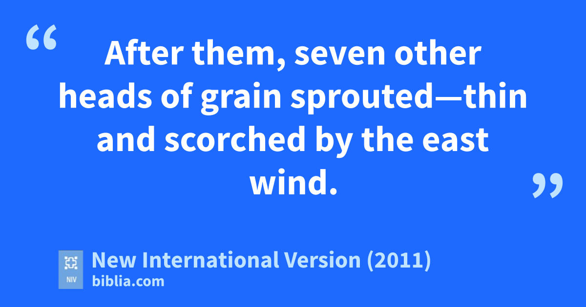 5 He fell asleep again and had a second dream: Seven heads of grain,j healthy and good, were growing on a single stalk. 6 After them, seven other heads of grain sprouted—thin and scorched by the east wind.k 7 The thin heads of grain swallowed up the seven healthy, full heads. Then Pharaoh woke up;l it had been a dream.