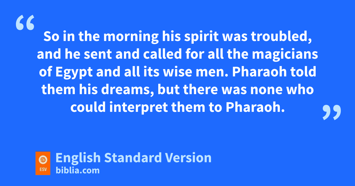 41 After two whole years, Pharaoh dreamed that he was standing by the Nile, 2 and behold, there came up out of the Nile seven cows, attractive and plump, and they fed in the reed grass. 3 And behold, seven other cows, ugly and thin, came up out of the Nile after them, and stood by the other cows on the bank of the Nile. 4 And the ugly, thin cows ate up the seven attractive, plump cows. And Pharaoh awoke. 5 And he fell asleep and dreamed a second time. And behold, seven ears of grain, plump and good, were growing on one stalk. 6 And behold, after them sprouted seven ears, thin and wblighted by the east wind. 7 And the thin ears swallowed up the seven plump, full ears. And Pharaoh awoke, and behold, it was a dream. 8 So in the morning xhis spirit was troubled, and he sent and called for all the ymagicians of Egypt and all its wise men. Pharaoh told them his dreams, but there was none who could interpret them to Pharaoh.
