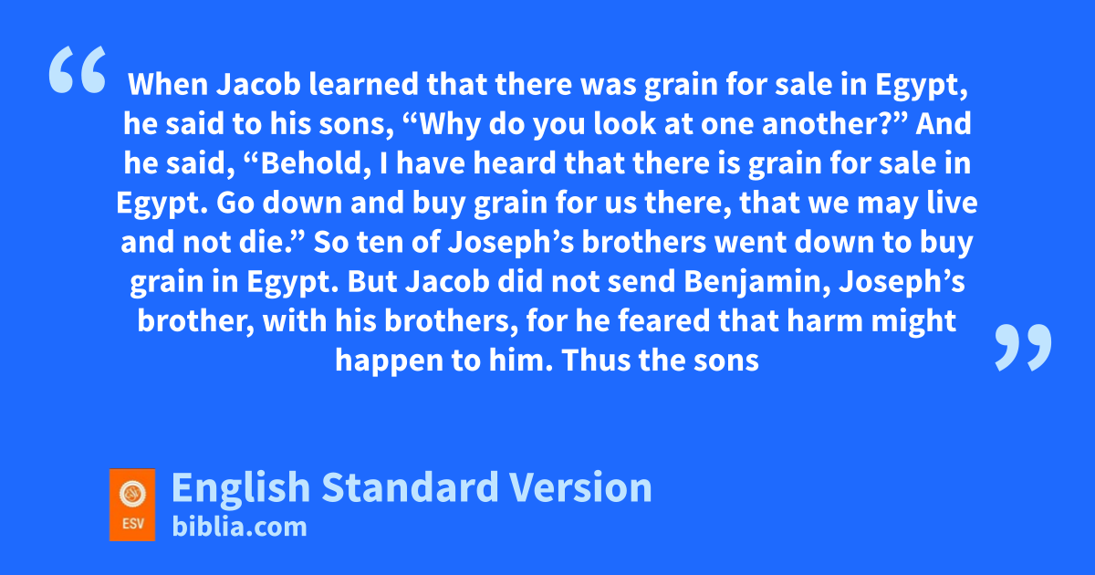 42 When lJacob learned that there was grain for sale in Egypt, he said to his sons, “Why do you look at one another?” 2 And he said, “Behold, I have heard that there is grain for sale in Egypt. Go down and buy grain for us there, that we may mlive and not die.” 3 So ten of Joseph’s brothers went down to buy grain in Egypt. 4 But Jacob did not send Benjamin, nJoseph’s brother, with his brothers, for ohe feared that harm might happen to him. 5 Thus the sons of Israel came to buy among the others who came, for the famine was in the land of Canaan.