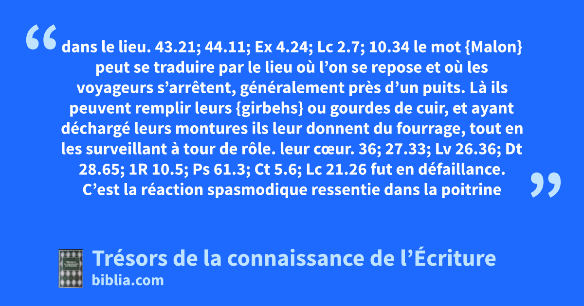 dans le lieu. 43.21; 44.11; Ex 4.24; Lc 2.7; 10.34 le mot {Malon} peut se traduire par le lieu où l’on se repose et où les voyageurs s’arrêtent, généralement près d’un puits. Là ils peuvent remplir leurs {girbehs} ou gourdes de cuir, et ayant déchargé leurs montures ils leur donnent du fourrage, tout en les surveillant à tour de rôle.