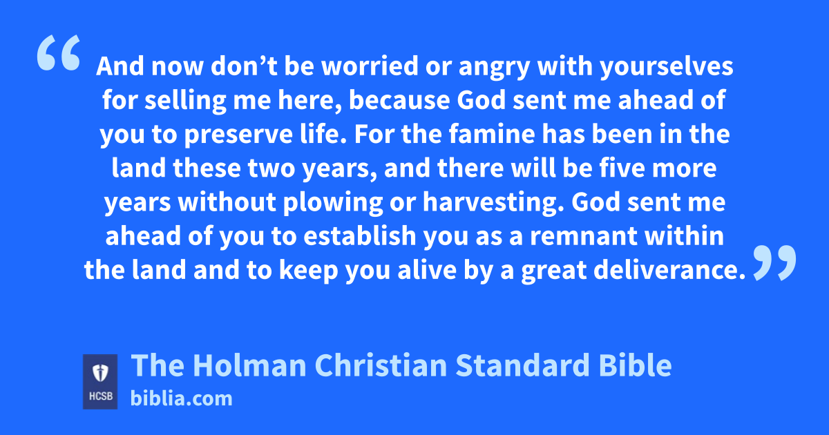4 Then Joseph said to his brothers, “Please, come near me,” and they came near. “I am Joseph, your brother,” he said, “the one you sold into Egypt. v 5 And now don’t be worried or angry with yourselves for selling me here, because God sent me ahead of you to preserve life. w 6 For the famine has been in the land these two years, and there will be five more years without plowing or harvesting. 7 God sent me ahead of you to establish you as a remnant within the land and to keep you alive by a great deliverance. x 8 Therefore it was not you who sent me here, but God. He has made me a father to Pharaoh, lord of his entire household, and ruler over all the land of Egypt.