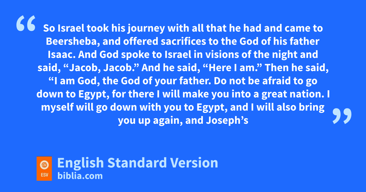 46 So Israel took his journey with all that he had and came to gBeersheba, and offered sacrifices hto the God of his father Isaac. 2 And God spoke to Israel iin visions of the night and said, “Jacob, Jacob.” And he said, “Here I am.” 3 Then he said, “I am God, jthe God of your father. Do not be afraid to go down to Egypt, for there I will kmake you into a great nation. 4 I myself will go down with you to Egypt, and I will also lbring you up again, and mJoseph’s hand shall close your eyes.”
