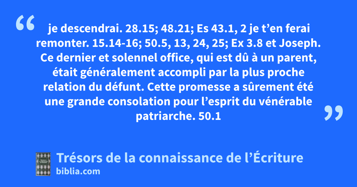 je descendrai. 28.15; 48.21; Es 43.1, 2 je t’en ferai remonter. 15.14-16; 50.5, 13, 24, 25; Ex 3.8 et Joseph. Ce dernier et solennel office, qui est dû à un parent, était généralement accompli par la plus proche relation du défunt. Cette promesse a sûrement été une grande consolation pour l’esprit du vénérable patriarche. 50.1