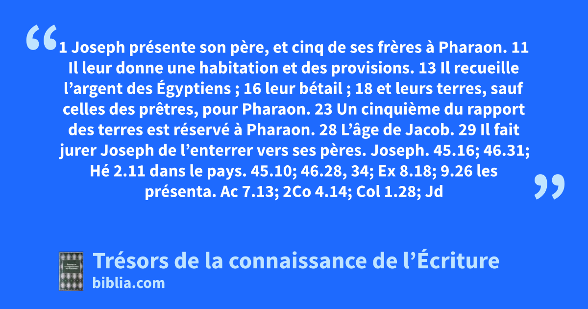 1 Joseph présente son père, et cinq de ses frères à Pharaon. 11 Il leur donne une habitation et des provisions. 13 Il recueille l’argent des Égyptiens ; 16 leur bétail ; 18 et leurs terres, sauf celles des prêtres, pour Pharaon. 23 Un cinquième du rapport des terres est réservé à Pharaon. 28 L’âge de Jacob. 29 Il fait jurer Joseph de l’enterrer vers ses pères.