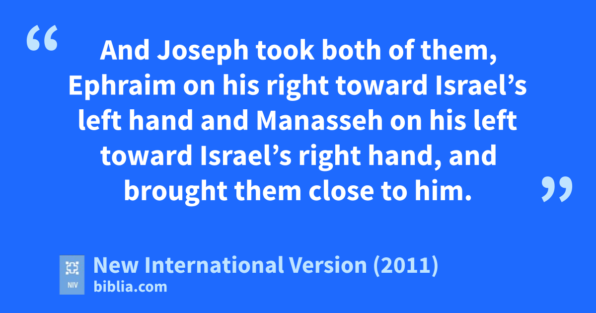 12 Then Joseph removed them from Israel’s kneeso and bowed down with his face to the ground.p 13 And Joseph took both of them, Ephraim on his right toward Israel’s left hand and Manasseh on his left toward Israel’s right hand,q and brought them close to him. 14 But Israelr reached out his right hand and put it on Ephraim’s head,s though he was the younger,t and crossing his arms, he put his left hand on Manasseh’s head, even though Manasseh was the firstborn.u