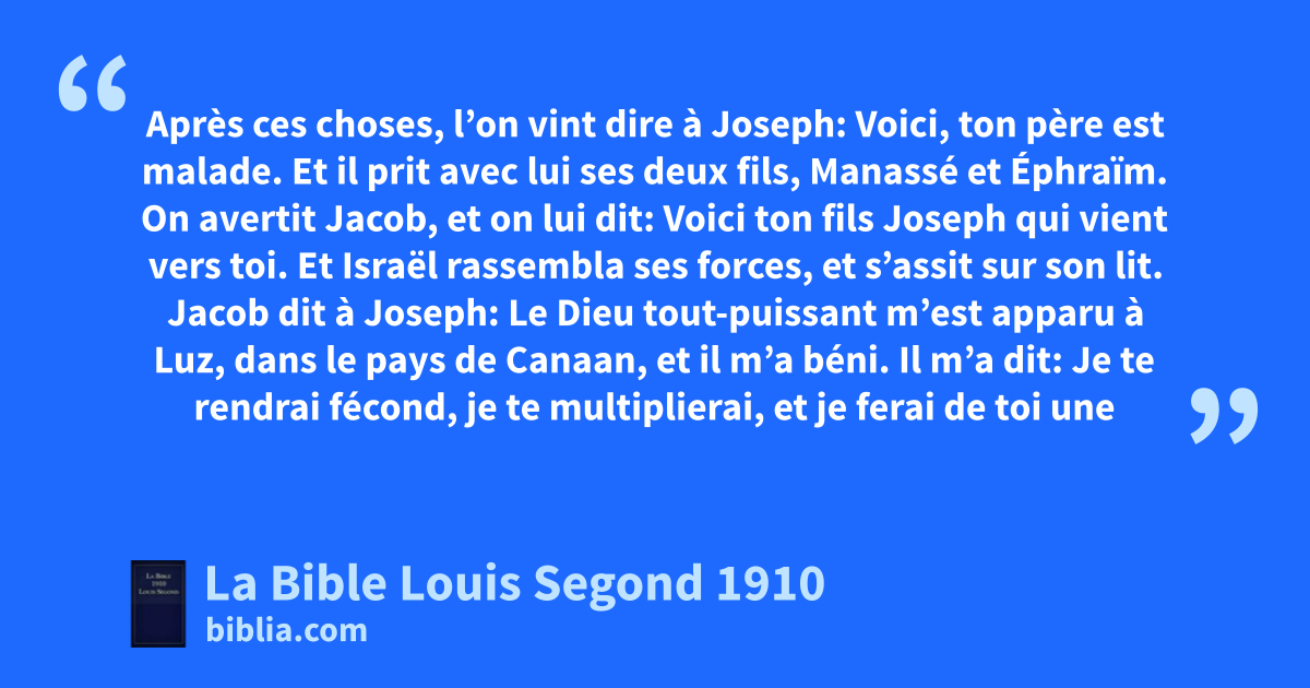 1Après ces choses, l’on vint dire à Joseph: Voici, ton père est malade. Et il prit avec lui ses deux fils, Manassé et Éphraïm. 2On avertit Jacob, et on lui dit: Voici ton fils Joseph qui vient vers toi. Et Israël rassembla ses forces, et s’assit sur son lit. 3Jacob dit à Joseph: Le Dieu atout-puissant bm’est apparu à Luz, dans le pays de Canaan, et il m’a béni. 4Il m’a dit: cJe te rendrai fécond, je te multiplierai, et je ferai de toi une multitude de peuples; je donnerai ce pays à ta postérité après toi, pour qu’elle le possède à toujours. 5Maintenant, les deux fils dqui te sont nés au pays d’Égypte, avant mon arrivée vers toi en Égypte, seront à moi; Éphraïm et Manassé seront à moi, comme Ruben et Siméon. 6Mais les enfants que tu as engendrés après eux seront à toi; ils seront appelés du nom de leurs frères dans leur héritage. 7A mon retour de Paddan, eRachel mourut en route auprès de moi, dans le pays de Canaan, à quelque distance d’Éphrata; et c’est là que je l’ai enterrée, sur le chemin d’Éphrata, qui est Bethléhem.