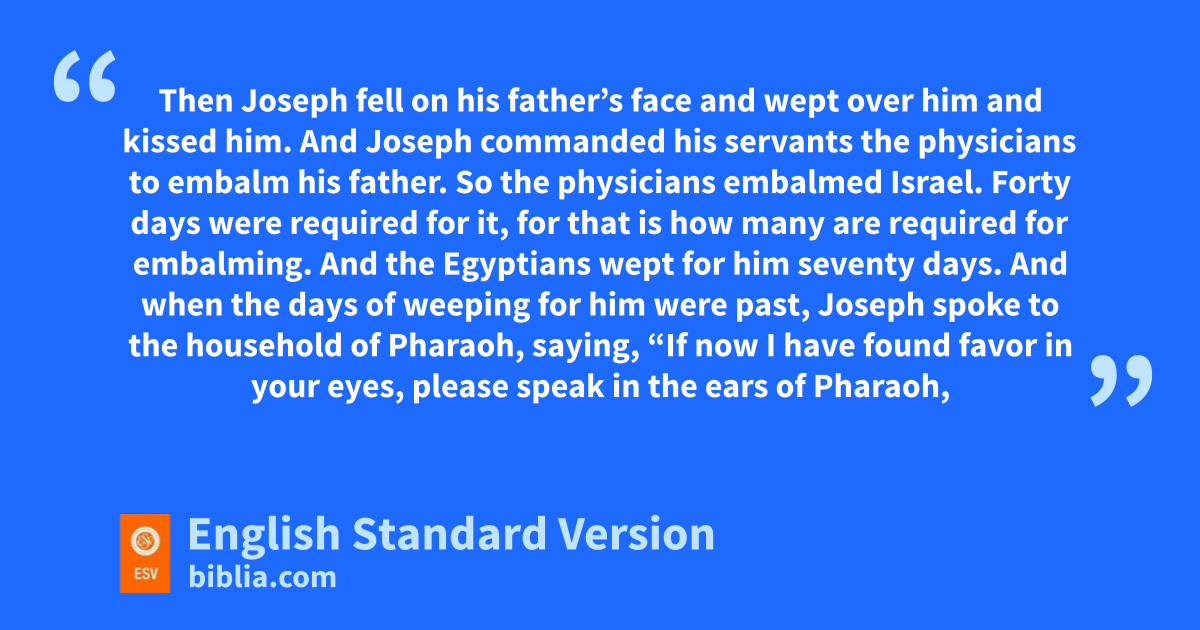 50 Then Joseph vfell on his father’s face and wept over him and kissed him. 2 And Joseph commanded his servants the physicians to wembalm his father. So the physicians embalmed Israel. 3 Forty days were required for it, for that is how many are required for embalming. And the Egyptians xwept for him seventy days.