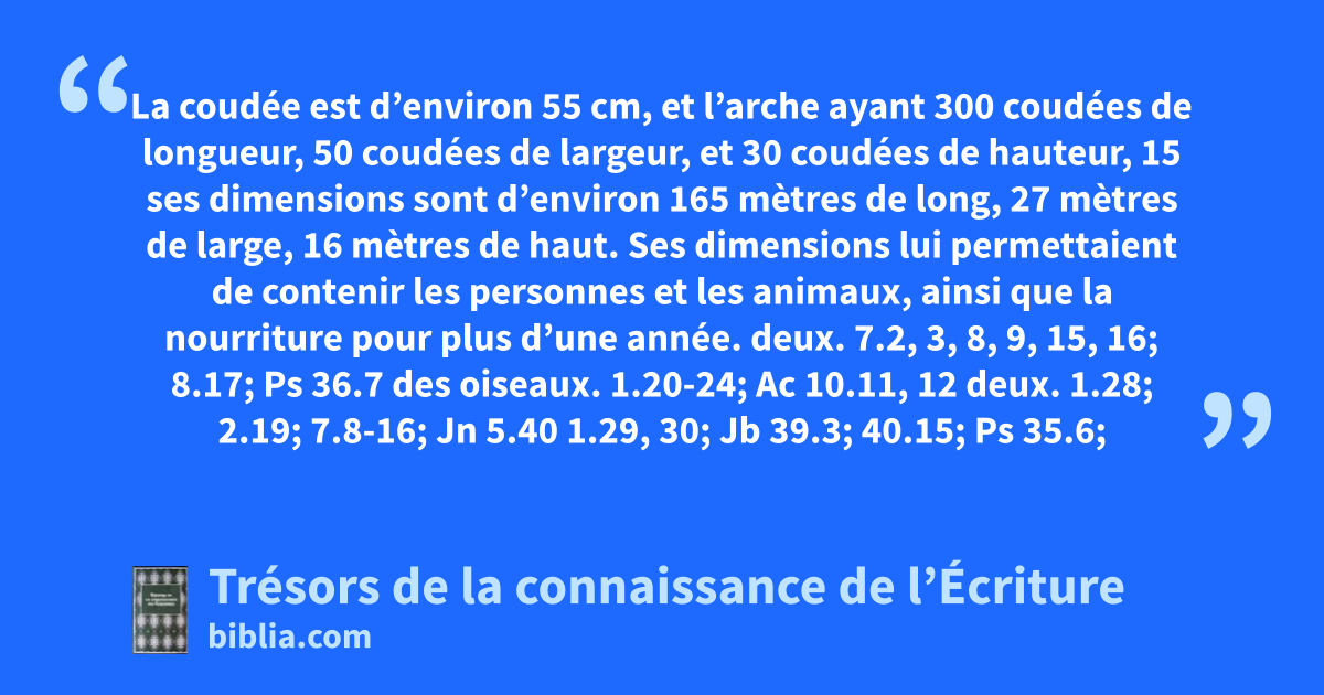 La coudée est d’environ 55 cm, et l’arche ayant 300 coudées de longueur, 50 coudées de largeur, et 30 coudées de hauteur, 15 ses dimensions sont d’environ 165 mètres de long, 27 mètres de large, 16 mètres de haut. Ses dimensions lui permettaient de contenir les personnes et les animaux, ainsi que la nourriture pour plus d’une année. deux. 7.2, 3, 8, 9, 15, 16; 8.17; Ps 36.7