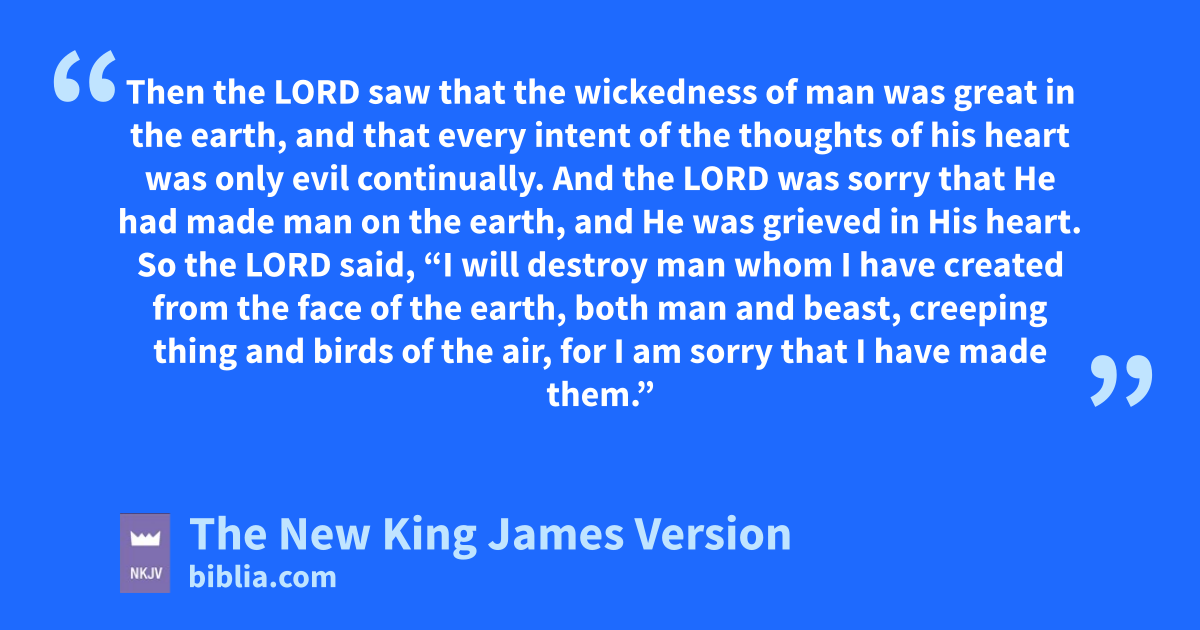 5 Then 3the Lord saw that the wickedness of man was great in the earth, and that every gintent 4of the thoughts of his heart was only evil 5continually. 6 And hthe Lord was sorry that He had made man on the earth, and iHe was grieved in His jheart. 7 So the Lord said, “I will kdestroy man whom I have created from the face of the earth, both man and beast, creeping thing and birds of the air, for I am sorry that I have made them.” 8 But Noah lfound grace in the eyes of the Lord.