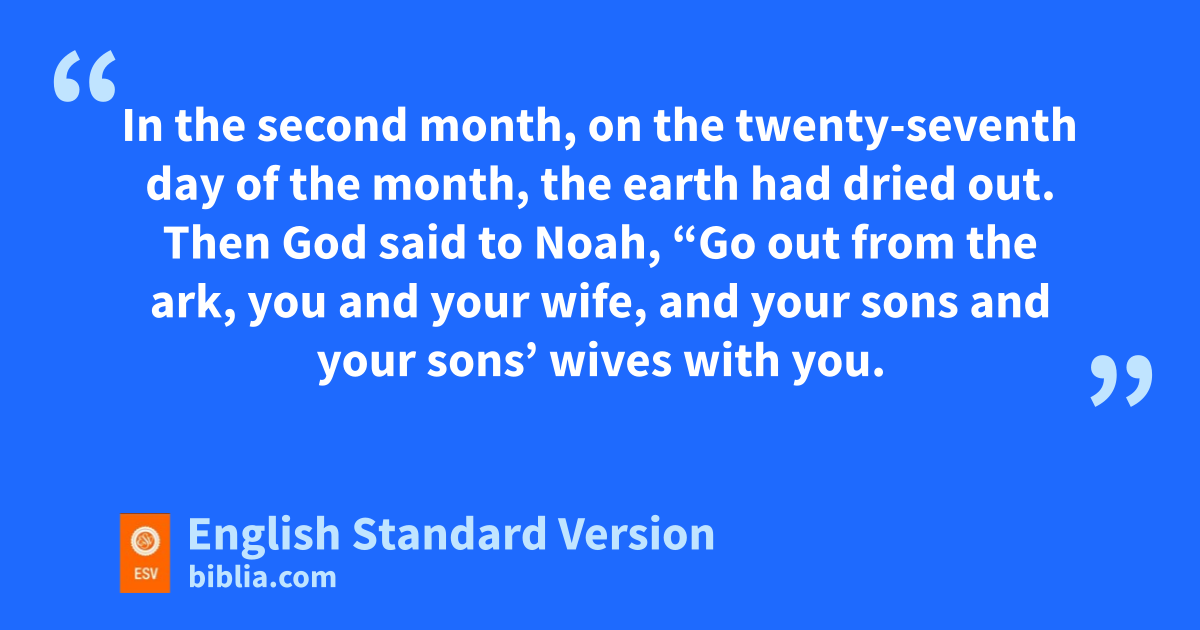 13 In the six hundred and first year, in the first month, the first day of the month, the waters were dried from off the earth. And Noah removed the covering of the ark and looked, and behold, the face of the ground was dry. 14 In the second month, on the twenty-seventh day of the month, the earth had dried out. 15 Then God said to Noah, 16 “Go out from the ark, iyou and your wife, and your sons and your sons’ wives with you. 17 Bring out with you every living thing that is with you of all flesh—birds and animals and every creeping thing that creeps on the earth—that they may swarm on the earth, and jbe fruitful and multiply on the earth.” 18 So Noah went out, and his sons and his wife and his sons’ wives with him. 19 Every beast, every creeping thing, and every bird, everything that moves on the earth, went out by families from the ark.