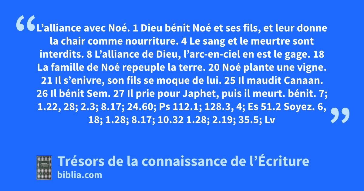 1 Dieu bénit Noé et ses fils, et leur donne la chair comme nourriture. 4 Le sang et le meurtre sont interdits. 8 L’alliance de Dieu, l’arc-en-ciel en est le gage. 18 La famille de Noé repeuple la terre. 20 Noé plante une vigne. 21 Il s’enivre, son fils se moque de lui. 25 Il maudit Canaan. 26 Il bénit Sem. 27 Il prie pour Japhet, puis il meurt.