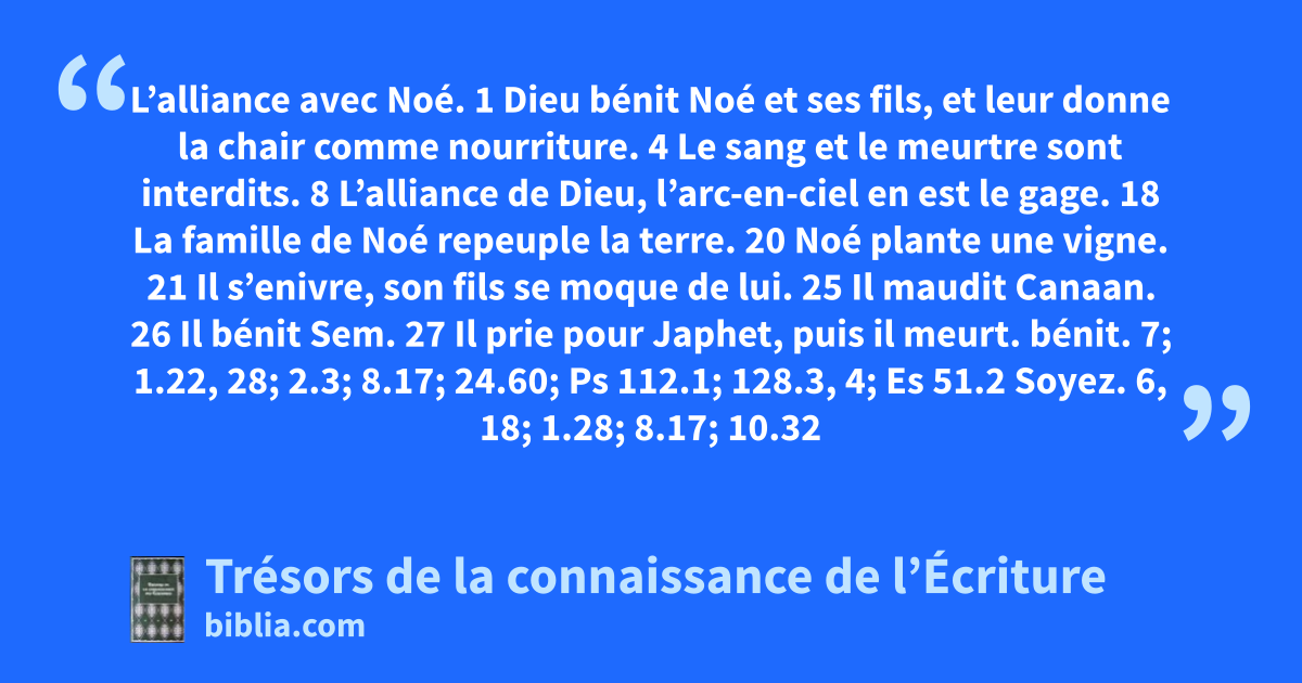 1 Dieu bénit Noé et ses fils, et leur donne la chair comme nourriture. 4 Le sang et le meurtre sont interdits. 8 L’alliance de Dieu, l’arc-en-ciel en est le gage. 18 La famille de Noé repeuple la terre. 20 Noé plante une vigne. 21 Il s’enivre, son fils se moque de lui. 25 Il maudit Canaan. 26 Il bénit Sem. 27 Il prie pour Japhet, puis il meurt.