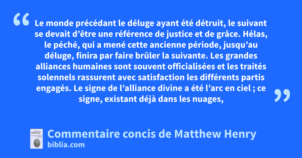 Le monde précédant le déluge ayant été détruit, le suivant se devait d’être une référence de justice et de grâce. Hélas, le péché, qui a mené cette ancienne période, jusqu’au déluge, finira par faire brûler la suivante. Les grandes alliances humaines sont souvent officialisées et les traités solennels rassurent avec satisfaction les différents partis engagés. Le signe de l’alliance divine a été l’arc en ciel ; ce signe, existant déjà dans les nuages, avant le déluge, n’a reçu véritablement sa valeur que lorsque Dieu a fait cette déclaration. L’arc en ciel apparaît quand nous avons de bonnes raisons de craindre la tempête et la pluie ; Dieu rappelle alors Sa promesse et ne reviendra pas dessus. Plus les nuages sont menaçants, plus l’arc en ciel est vif. Il en est de même dans nos vies : c’est au sein des épreuves les plus dures que la consolation divine est la plus vive. L’arc en ciel résulte de la réflexion et de la décomposition des gouttes d’eau par les rayons de lumière. Toute la gloire de l’alliance divine découle de Christ, le Soleil de droiture. Il répandra Sa gloire sur les saints, lors de l’épreuve.
