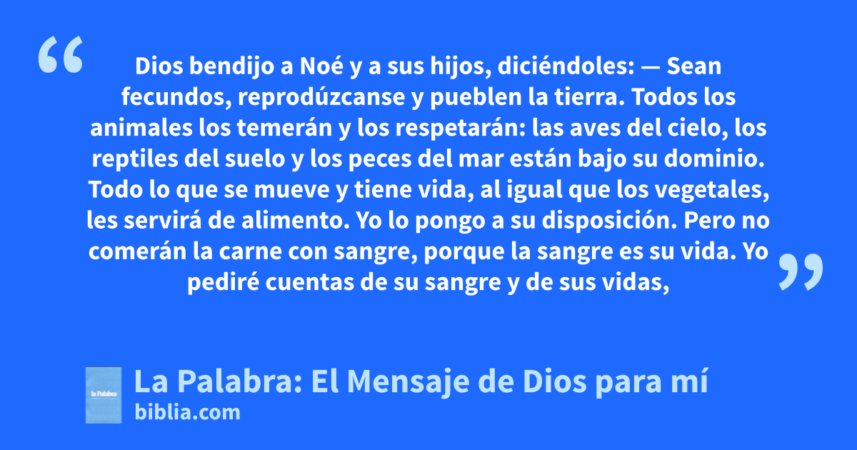 — Sean fecundos, reprodúzcanse y pueblen la tierra. 2 Todos los animales los temerán y los respetarán: las aves del cielo, los reptiles del suelo y los peces del mar están bajo su dominio. 3 Todo lo que se mueve y tiene vida, al igual que los vegetales, les servirá de alimento. Yo lo pongo a su disposición. 4 Pero no comerán la carne con sangre, porque la sangre es su vida. 5 Yo pediré cuentas de su sangre y de sus vidas, se lo reclamaré a cualquier animal. También a cualquier ser humano que mate a un hermano suyo, le pediré cuentas de esa vida.