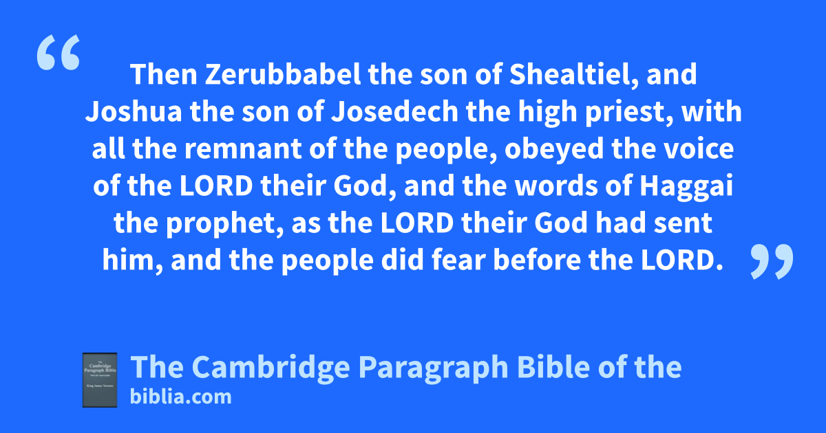 12 zThen bZerubbabel the son of cShealtiel, and dJoshua the son of deJosedech the high priest, with all athe remnant of the people, obeyed the voice of the Lord their God, and the words of Haggai the prophet, as the Lord their God had sent him, and the people did fear before the Lord. 13 Then spake Haggai bthe Lord’s messenger in the Lord’s message unto the people, saying, cI am with you, saith the Lord. 14 And dthe Lord stirred up the spirit of eZerubbabel the son of Shealtiel, egovernor of Judah, and the spirit of eJoshua the son of Josedech the high priest, and the spirit of all athe remnant of the people; and they came and fdid work in the house of the Lord of hosts, their God, 15 gin the four and twentieth day of the sixth month, in the second year of Darius the king.