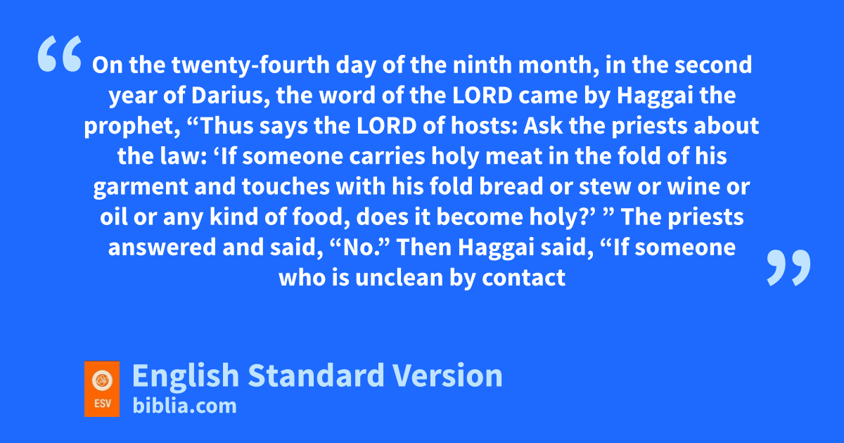 10 tOn the twenty-fourth day of the ninth month, uin the second year of Darius, the word of the Lord came by Haggai the prophet, 11 “Thus says the Lord of hosts: vAsk the priests about the law: 12 ‘If someone carries wholy meat in the fold of his garment and touches with his fold bread or stew or wine or oil or any kind of food, does it become holy?’ ” The priests answered and said, x“No.” 13 Then Haggai said, y“If someone who is unclean by contact with a dead body ztouches any of these, does it become unclean?” The priests answered and said, “It does become unclean.” 14 Then Haggai answered and said, a“So is it with this people, and with this nation before me, declares the Lord, and so with every work of their hands. And what they offer there is unclean. 15 Now then, bconsider from this day onward.1 Before stone was placed upon stone in the temple of the Lord, 16 how did you fare? cWhen2 one came to a heap of twenty measures, there were but ten. When one came to the wine vat to draw fifty measures, there were but twenty. 17 dI struck you and all the products of your toil with blight and with mildew and with hail, eyet you did not turn to me, declares the Lord. 18 bConsider from this day onward, ffrom the twenty-fourth day of the ninth month. Since gthe day that the foundation of the Lord’s temple was laid, bconsider: 19 hIs the seed yet in the barn? Indeed, the vine, the fig tree, the pomegranate, and the olive tree have yielded nothing. But from this day on iI will bless you.”