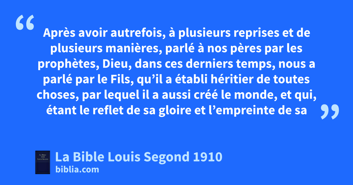1Après avoir autrefois, à plusieurs reprises et de plusieurs manières, parlé à nos pères par les prophètes, 2Dieu, dans ces derniers temps, nous a parlé par le Fils, aqu’il a établi héritier de toutes choses, bpar lequel il a aussi créé le monde, 3et cqui, étant le reflet de sa gloire et l’empreinte de sa personne, et soutenant toutes choses par sa parole puissante, a fait la purification des péchés et s’est assis à la droite de la majesté divine dans les lieux très hauts, 4devenu d’autant supérieur aux anges qu’il a hérité d’un nom dplus excellent que le leur.